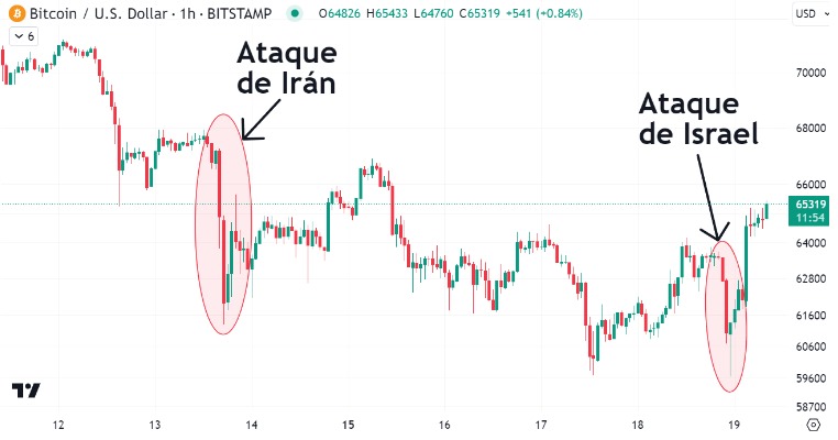 Es lo que pasó, por ejemplo, el fin de semana con el ataque de Irán a Israel, cuando el precio cayó de 67 a 61 mil dólares en cuanto se conoció la noticia. Y nuevamente con la represalia de Israel el precio cayó.